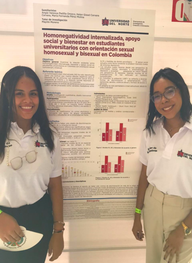 Para Helen Cervera y Angie Padilla, estudiantes en prácticas del departamento de Psicología, compartir su trabajo investigativo acerca de la homonegatividad internalizada con profesionales, estudiantes y público en general interesado, así como recibir comentarios positivos acerca de este, resaltando su relevancia y aporte significativo, ha sido una de las experiencias más gratificantes en su formación profesional al participar en el XXVI Encuentro Nacional de Semilleros de Investigación - ENISI 2023 – RedCOLSI, organizado del 11 al 14 de octubre en la Universidad de Cartagena.